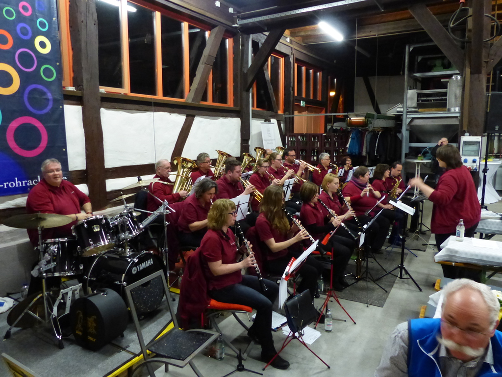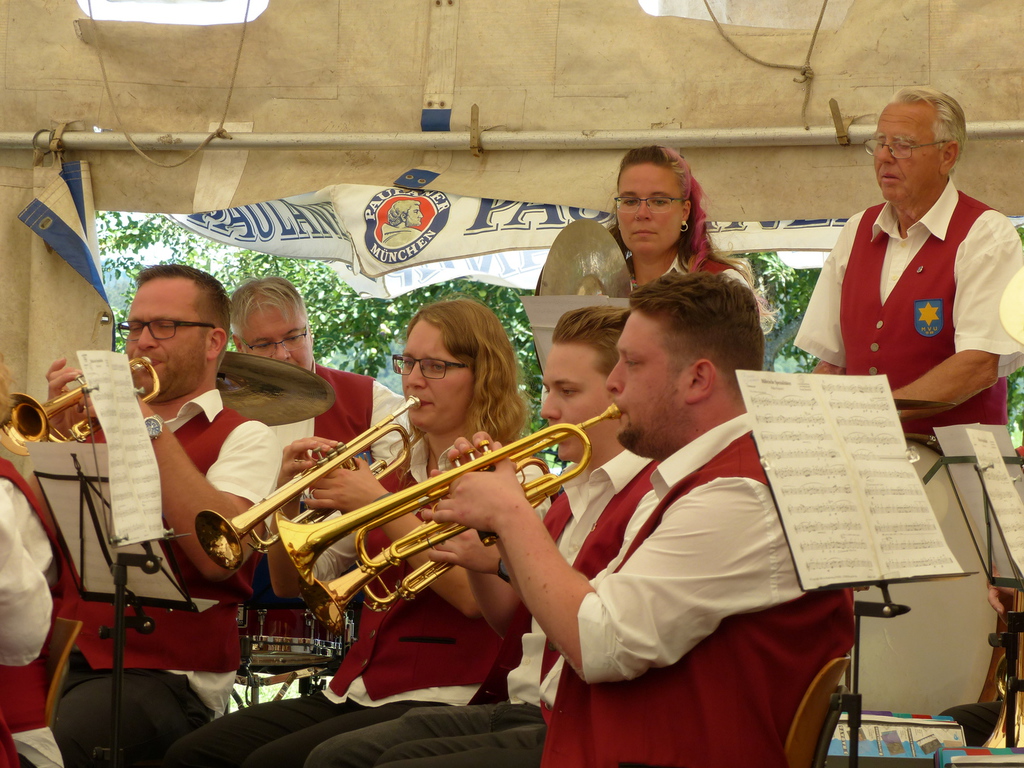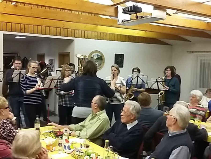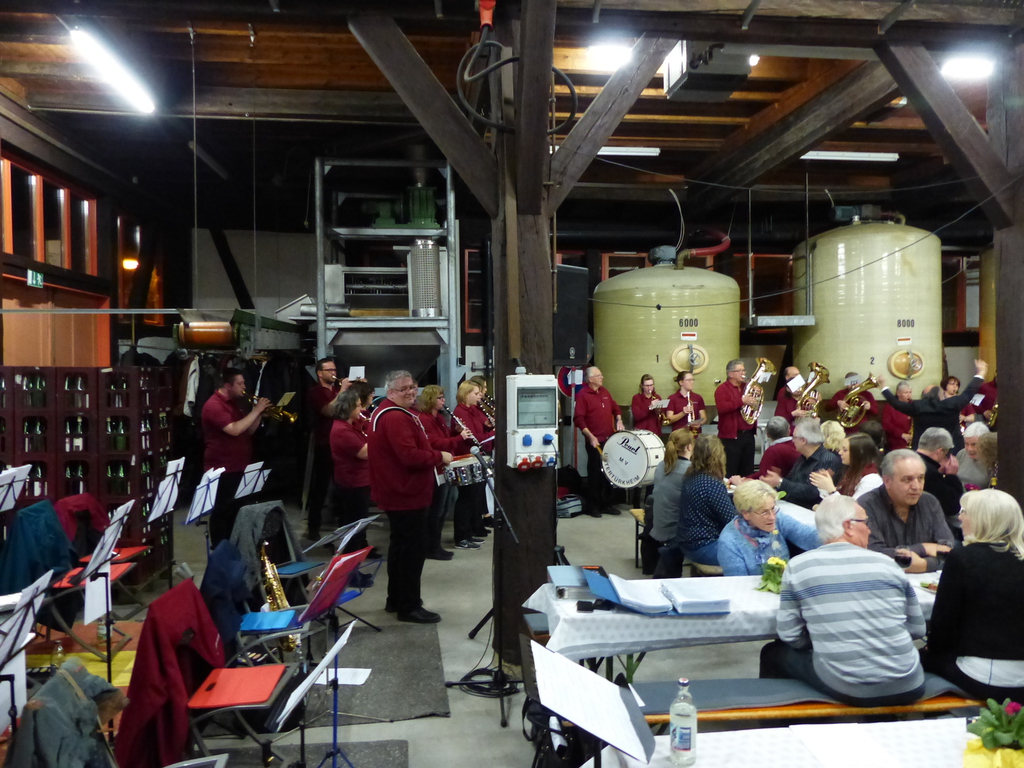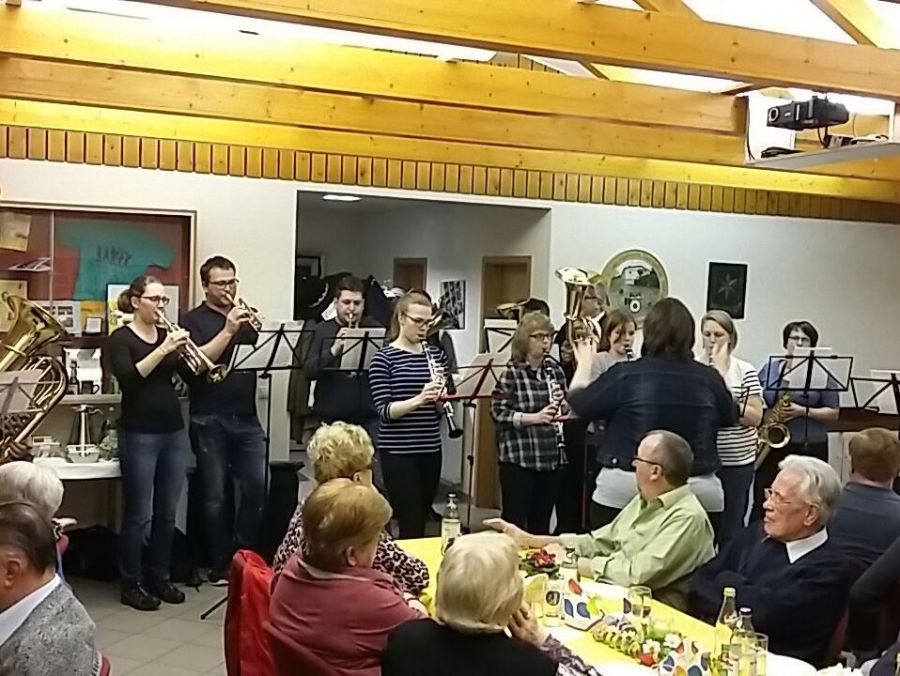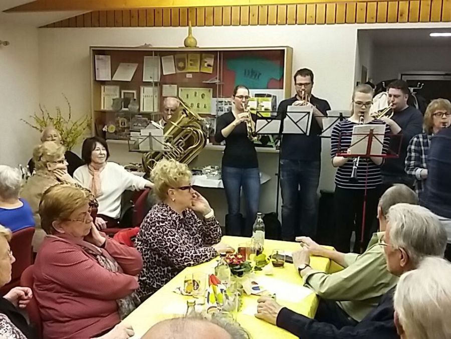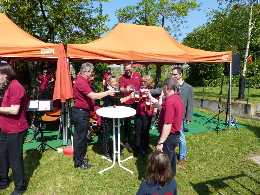 die leckeren Kuchen schmecken zu lassen, als da eine ganze Menge Leute mit Instrumenten reingekommen sind. Und die haben dem Eberhard ein Ständchen gespielt. Das war die Aktivenkapelle des