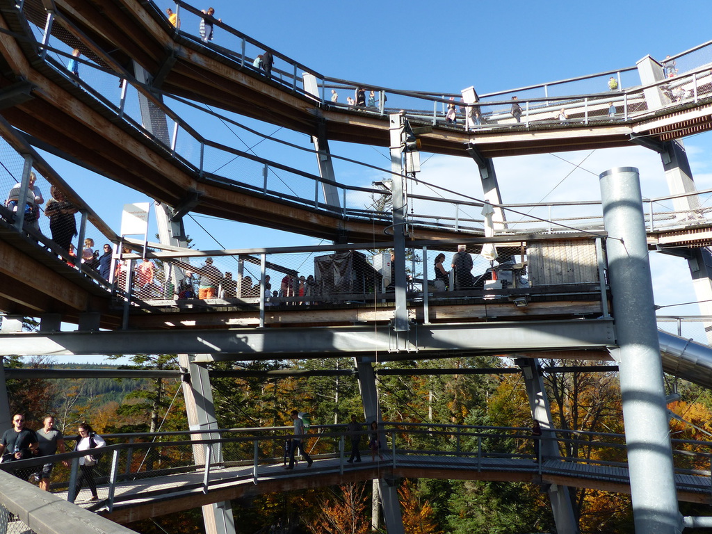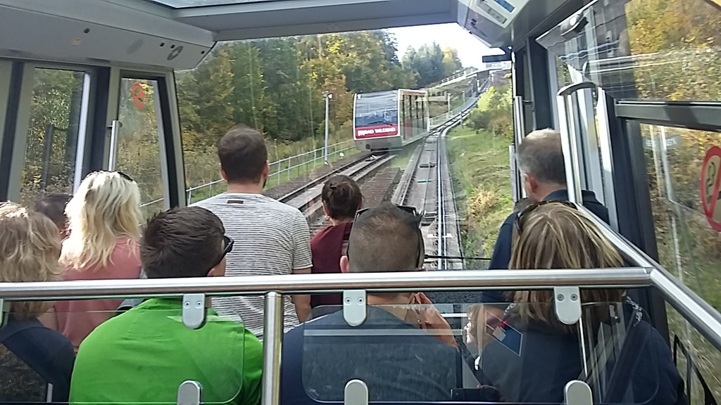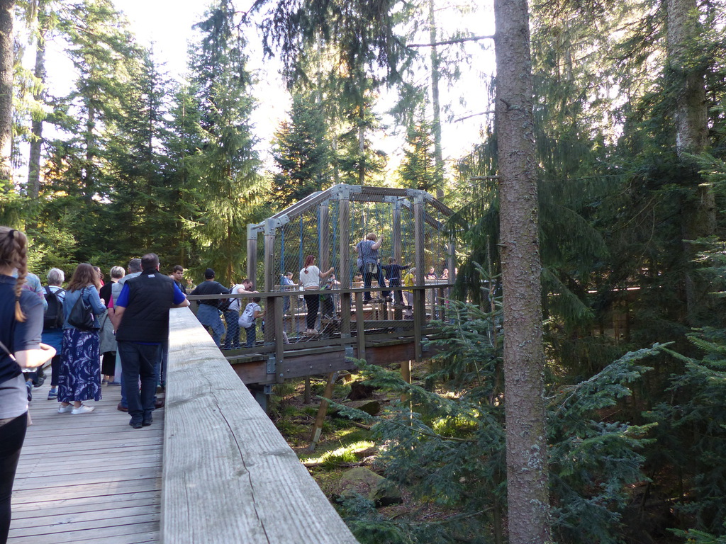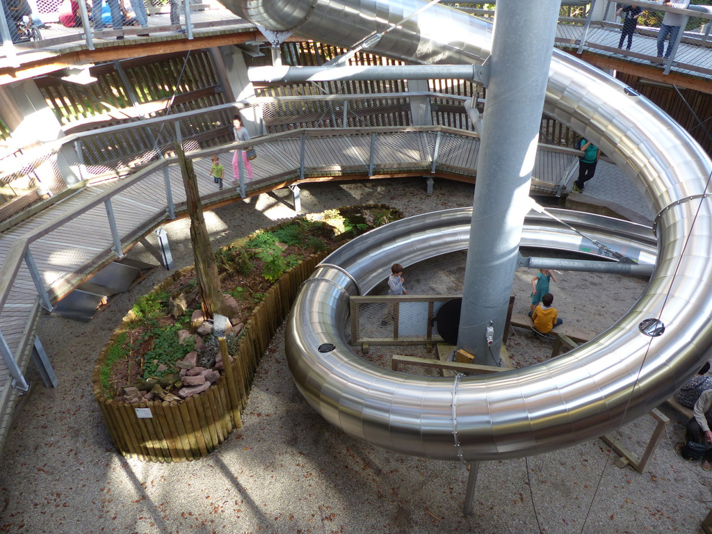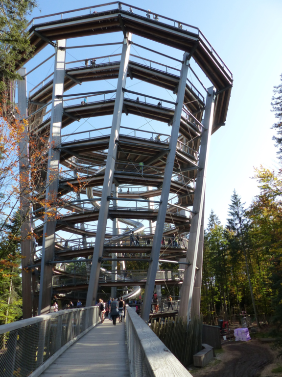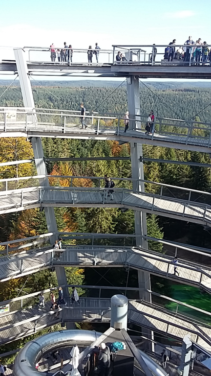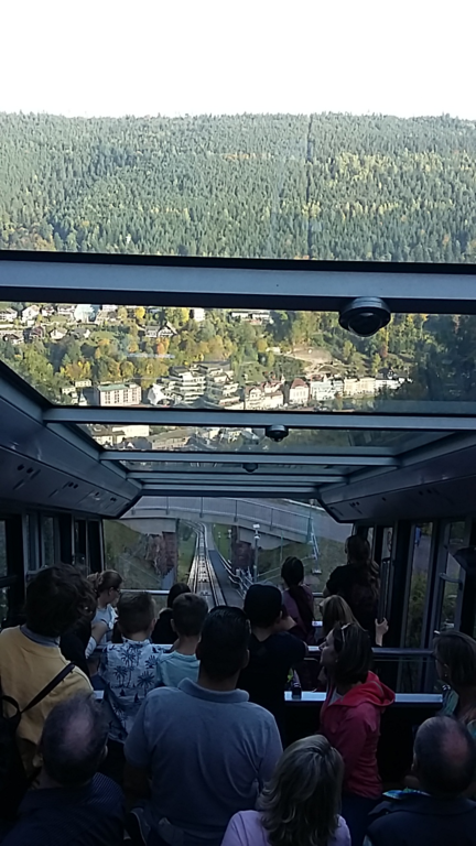 Nach der sonnigen Pause ging es weiter Richtung Bad Wildbad. Dort fuhren wir mit der Sommerbergbahn – einer Standseilbahn – von 428 m auf 726 m Höhe. Ein Großteil der Teilnehmer lief durch den 1250 m langen Baumwipfelpfad und auf den 40 m hohen Aussichtsturm, mit seiner 55 m langen Rutsche. Einige Teilnehmer besuchten aber auch das Panoramarestaurant, beziehungsweise den Biergarten an der Bergstation.