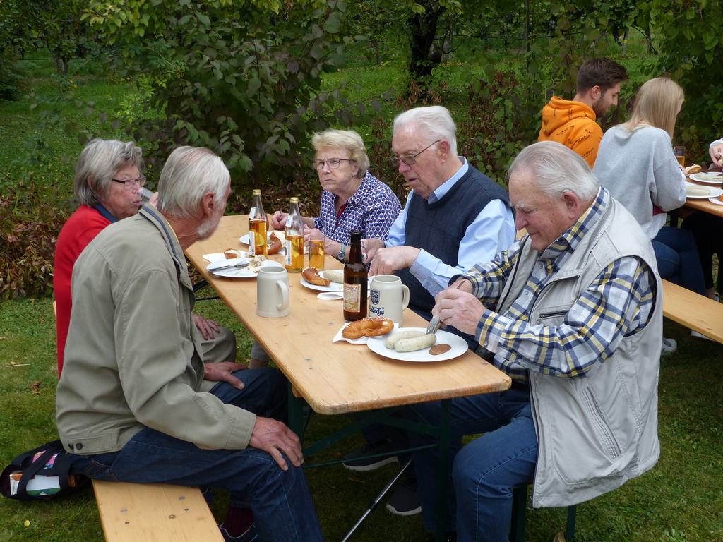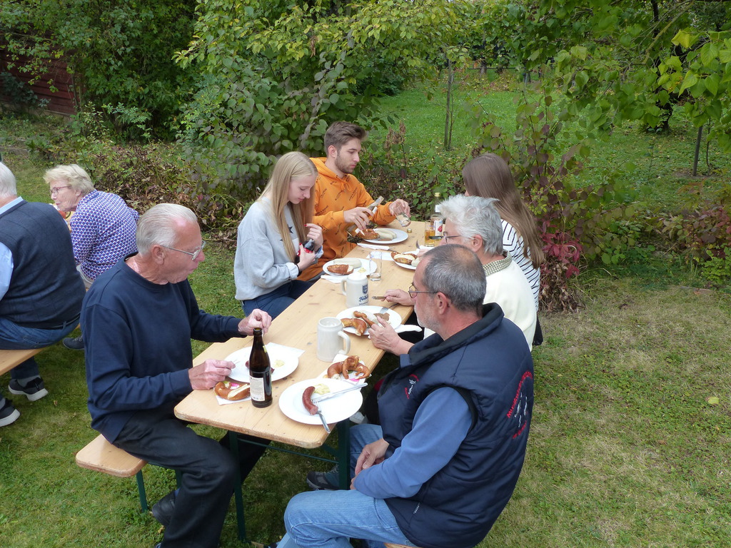 Zum Essen gab es wieder leckere Würste und Brezeln oder Rettich mit Schnittlauchbrot. Die Helfer trafen sich um 9:45 Uhr im Vereinsgarten, um alles für den Tag vorzubereiten. Die Tische und Bänke wurden aufgebaut und der Kühlschrank gefüllt.Um 11 Uhr war alles fertig - auch die leckeren Weißwürste - und auch die ersten Gäste waren schon da. Der Frühschoppen war mit ca. 40 Personen sehr gut besucht und es war eine sehr gelungene Veranstaltung.