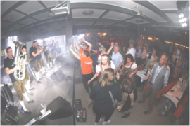 Die Fangemeinde hatte nach der langen Wartezeit auch richtig Lust auf VieraBlech. Die gutgelaunten Gäste füllten den Saal schnell und machten schon Stimmung, bevor die Musiker auf der Bühne waren. Als es dann losging, war kein Mensch mehr auf seinem Platz zu halten. Mit tosendem Applaus begrüßten sie VieraBlech. Die sieben Blechbläser spielten viele Eigenkompositionen von Martin Scharnagel, von welchen die Bekanntesten wohl die Polkas „Von Freund zu Freund“ und „Zeitlos“ sind. Die Fans bekamen ein Tenorhornsolo zu hören, bei dessen Geschwindigkeit einem schwindelig wurde. Und trotzdem konnte man jeden Ton des zweistimmigen Stückes erkennen, welch ein Wahnsinn. Das Solo des Tubisten setzt dem Ganzen die Krone auf: „Fünf mal so schnell“ hieß der Titel und so war es auch. In dieser Geschwindigkeit spielte der Bläser die Tuba sauber rauf und runter und erzeugte beim Publikum Gänsehaut.